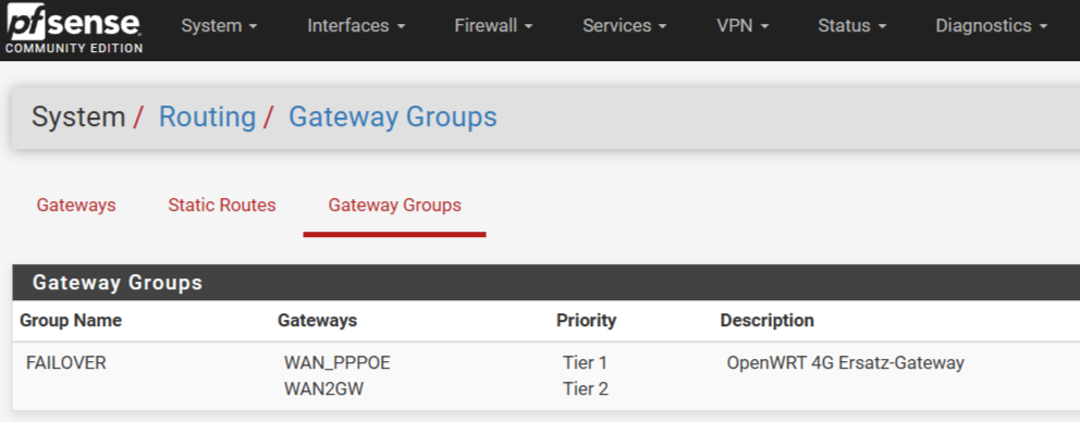 We then create a group under System > Routing > Gateway Groups. So that the modem takes over if the main line fails, we set the trigger level to "Packet Loss", the main gateway to "Tier 1" and the modem WAN to "Tier 2".